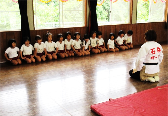 元気なあいさつで始まる明るい一日にするため、「立ち止まってあいさつ」運動 を促進しています。意思表示の力も「あいさつ」からと考えています。本園の先生による「柔道教室」では、「礼にはじまり、礼におわる」の基本精神を学びます。