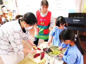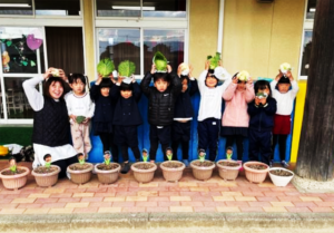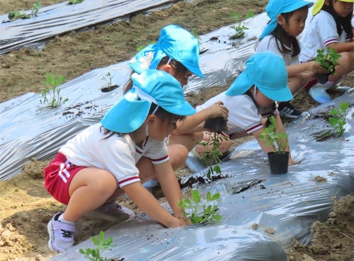 生き物に触れたり、自らの手で植物等を育てたりする中で、いたわりの心や感性・継続の大切さを学ぶとともに、食べ物への感謝の心を育みます。夏はトマトやナスなどの野菜を、冬はチューリップを育てます。また、地域の方々の協力で、サツマイモや落花生等の栽培活動を行い、収穫の喜びを味わいます。